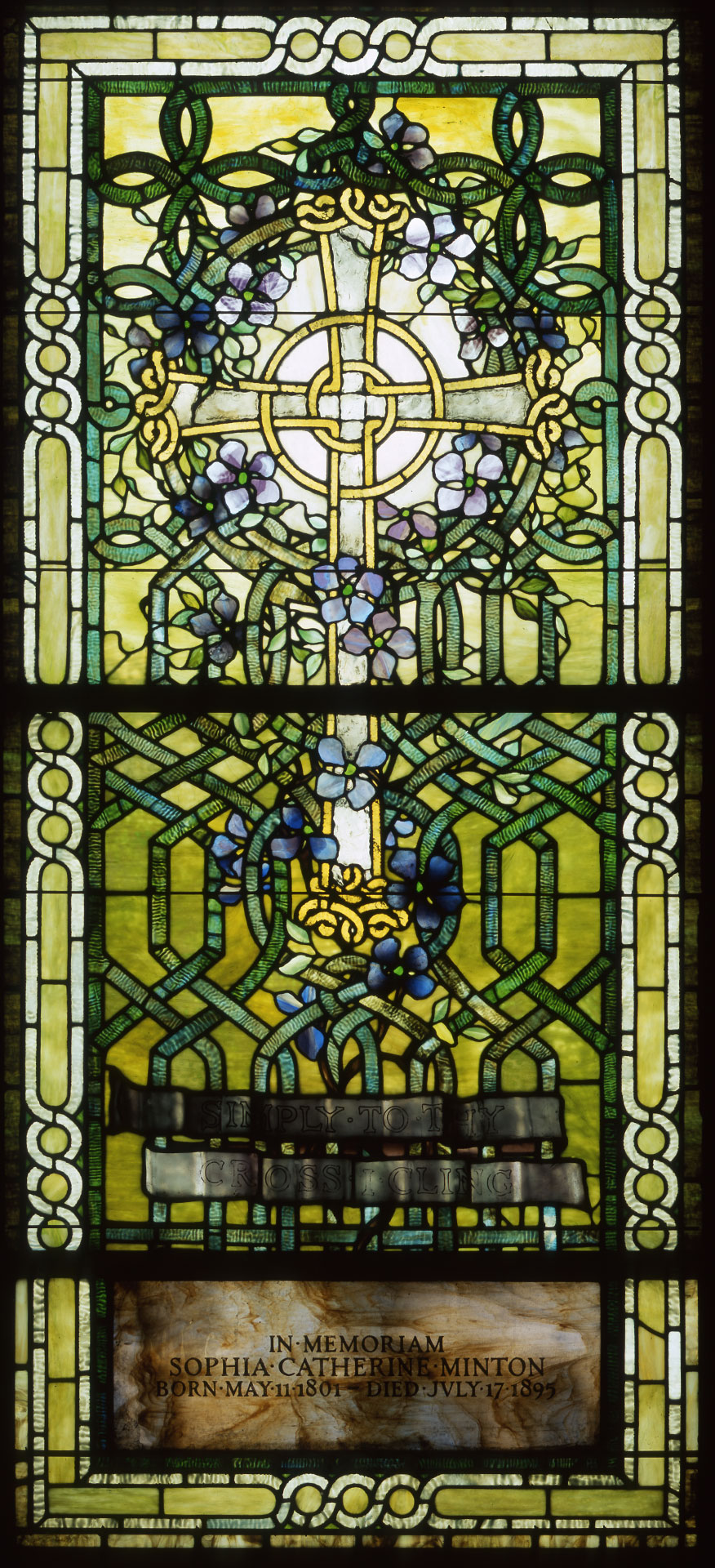Sophia Catherine Minton memorial window Highlights / Miscellaneous / Christmas in the Park / Sophia Catherine Minton memorial window Previous Next Sophia Catherine Minton memorial window, c. 1895 Chapel, Association for the Relief of Respectable, Aged, Indigent Females, New York City, 1814–1974 Leaded glass Tiffany Glass and Decorating Company, New York City, 1892–1902 102 × 47 in. (74-013)