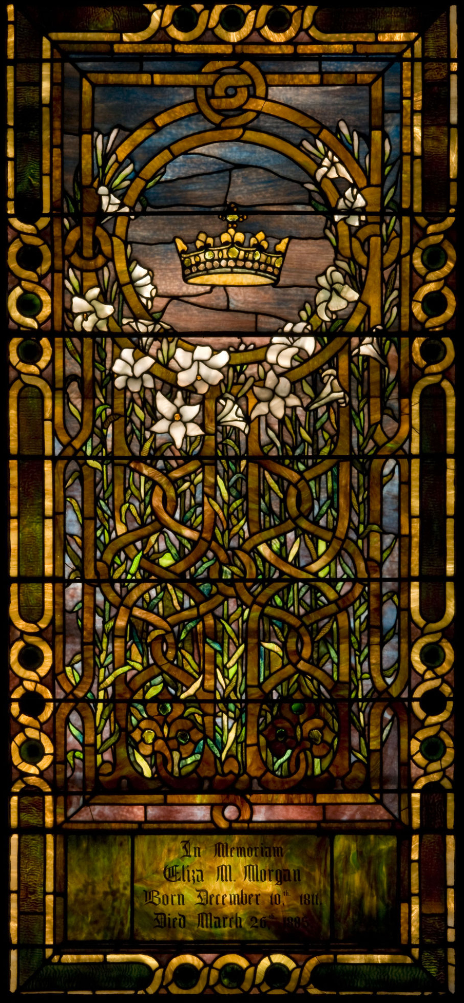 Eliza M. Morgan memorial window Highlights / Miscellaneous / Christmas in the Park / Eliza M. Morgan memorial window Previous Eliza M. Morgan memorial window, c. 1890s Leaded glass Tiffany Glass and Decorating, New York City, 1892–1902 99 × 45 1/2 in. (74-010)