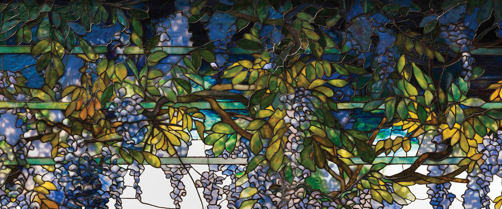 Tiffany decorated the interior of the mansion with thousands of fascinating and unique objects he had collected from around the world. Many also were designed by him or others in his studios—furniture, lighting fixtures, windows, desk sets, and more. Notably, the vast collection on view included art glass, enamels, and pottery marked “A-Coll.” for “Artist’s Collection”—pieces Tiffany collected from the production of his own studio. Some of the objects were virtuoso performances in their respective mediums, special pieces Tiffany created to show his greatest capability. The Four Seasons window, for example, which Tiffany cut into four panels for the Laurelton Hall living room, won a gold medal at the Exposition Universelle in Paris in 1900 and inspired the French government to award Tiffany the Chevalier of the Legion of Honor. Other parts of the decor, including the Wisteria transoms that topped clear glass windows in the dining room overlooking the gardens, were stunning works that incorporated favored decorative motifs from nature that have become synonymous with Tiffany’s style.