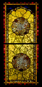 In the 1870s, artists Louis Comfort Tiffany (1848–1933) and John La Farge (1835–1910) began experimenting with opalescent glass, a semi-opaque and light-diffusing material used primarily in pressed glass tableware. When adapted to the new American glass windows, opalescent glass radically transformed the industry. The naturalistic aesthetic became immensely popular with patrons, divided the glass art community, and necessitated a change in vocabulary to the term “leaded glass.” Leaded-glass windows refer to those composed of any type of colored glass (stained or opalescent) joined by lead lines.